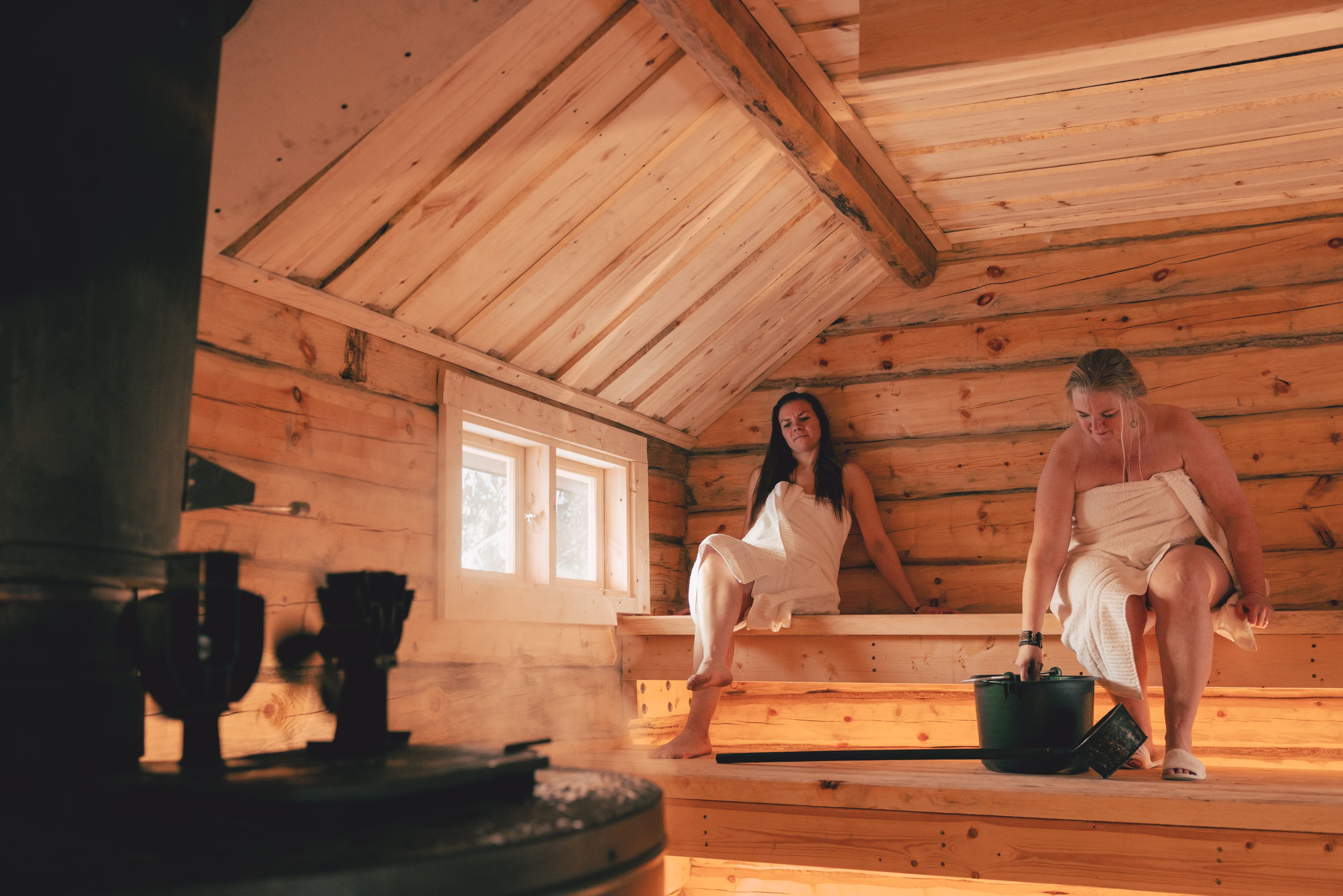 An authentic smoke sauna experience with 800 kg of stone, fired with aspen wood. The heat is round, soft and lingering – a deeply relaxing ritual that honours the very origins of sauna culture.